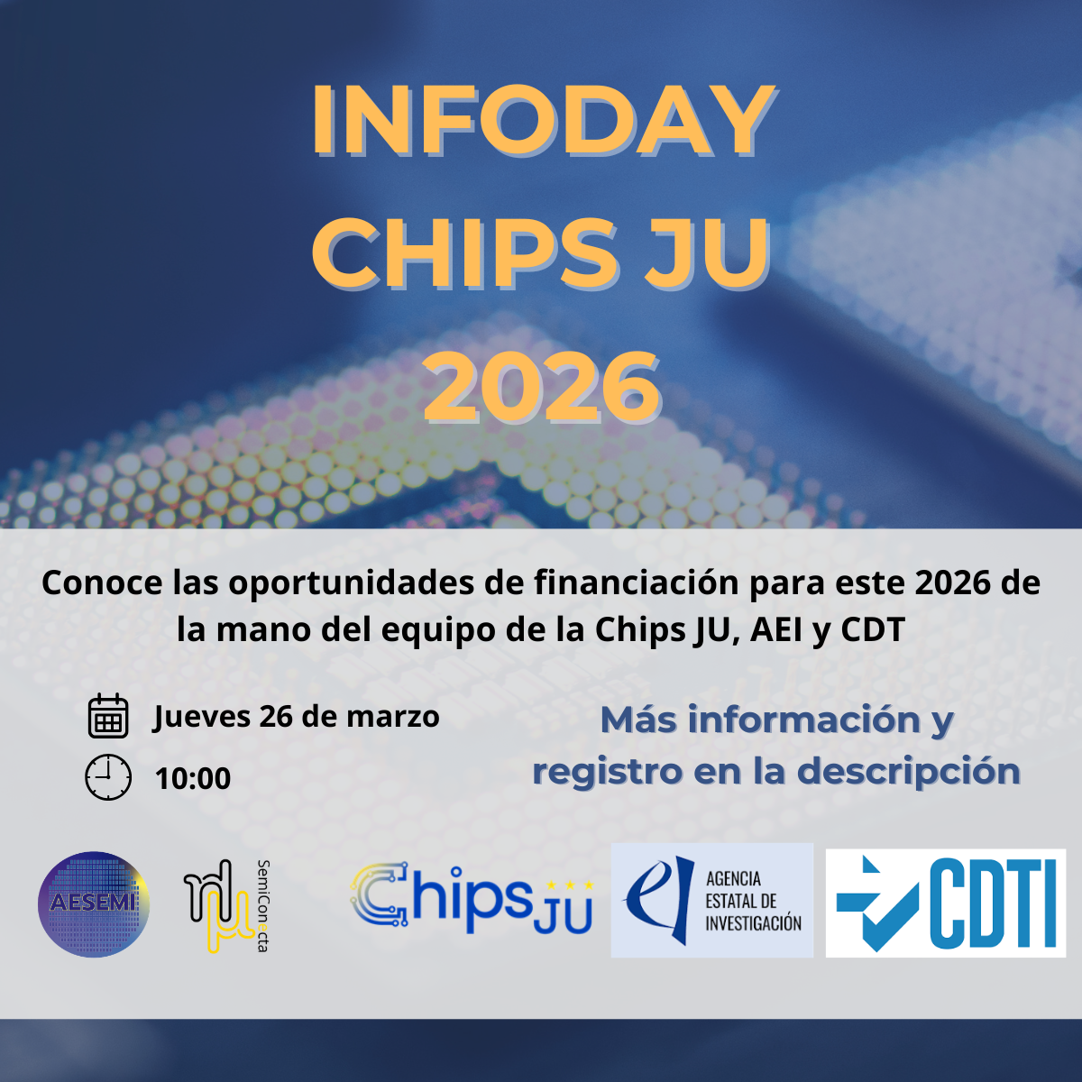 Os escribimos para informaros de que el próximo 26 de marzo, de 10:00 a 12:00, organizaremos el primer Infoday España sobre la Chips JU y las oportunidades de financiación para este año.