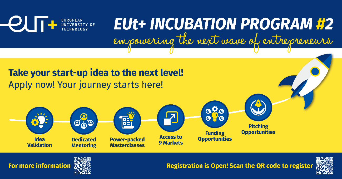 En esta ocasión, queremos informar que ya está abierta la convocatoria para participar en el EUt+ Incubation Programme #2, una iniciativa europea de aceleración de ideas de negocio dirigida al estudiantado del consorcio EUt+.