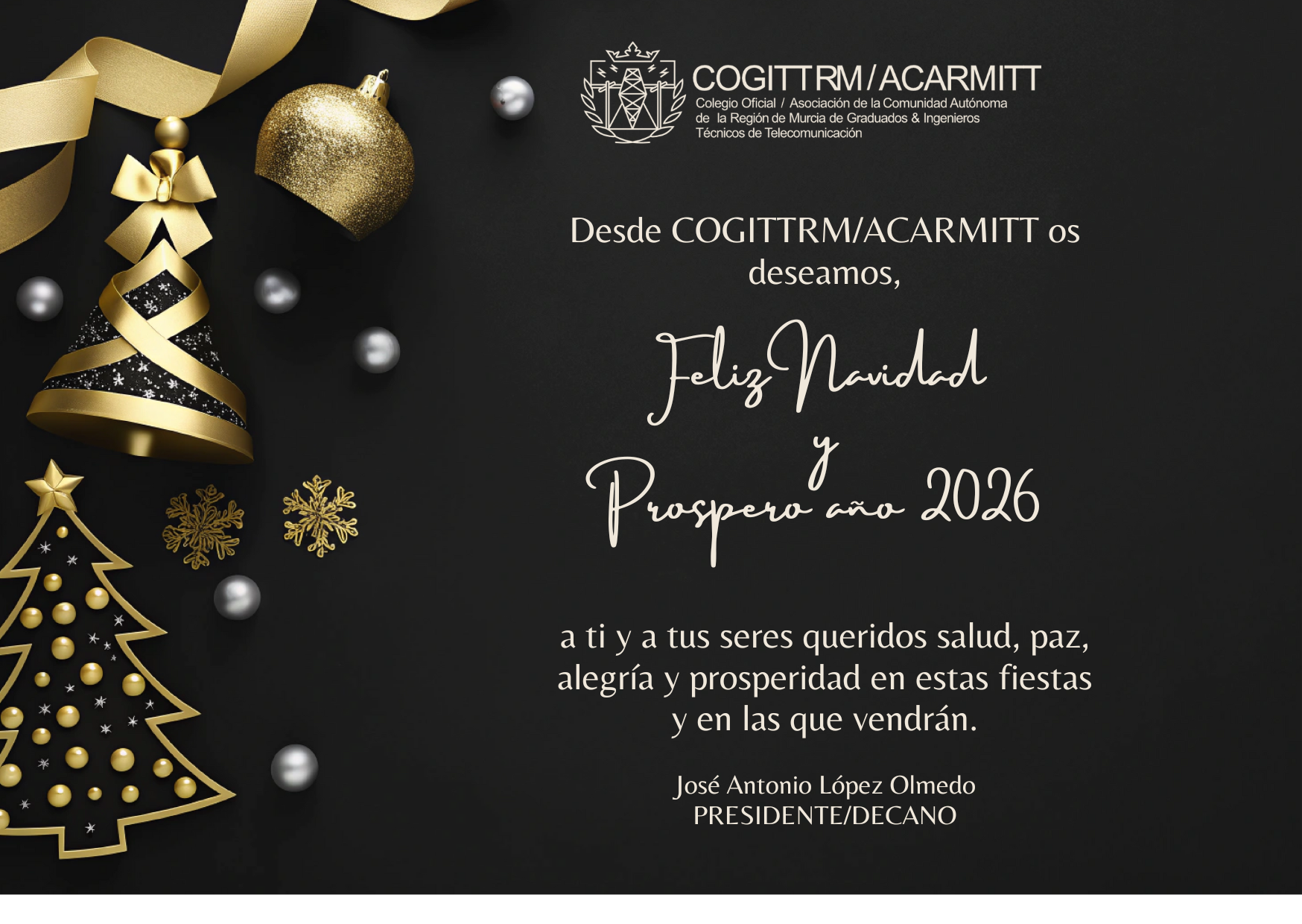 Les deseamos una Feliz Navidad y un próspero Año Nuevo, lleno de salud, ilusión y nuevos retos. Con nuestros mejores deseos, el Colegio y la Asociación de Ingenieros Técnicos de Telecomunicación de la Comunidad Autónoma de la Región de Murcia.